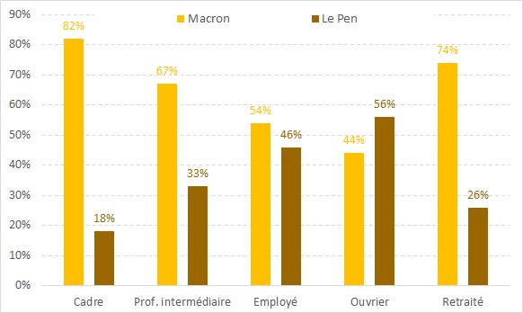 Traduzco la leyenda: Ejecutivos (Cadre), Profesionales intermedios, Empleados, Obreros, Jubilados.